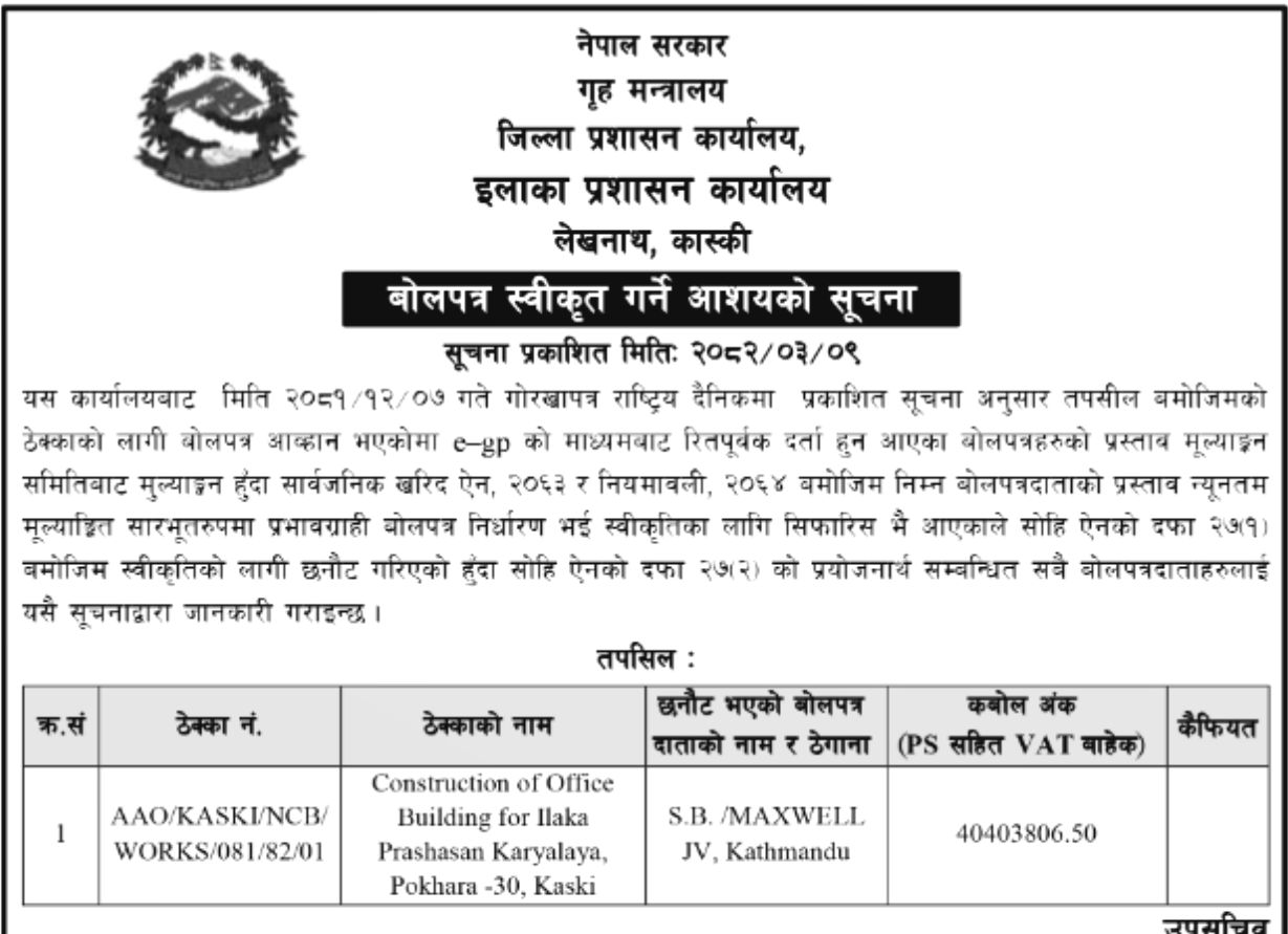 बोलपत्र स्वीकृत गर्ने आशयको सूचना